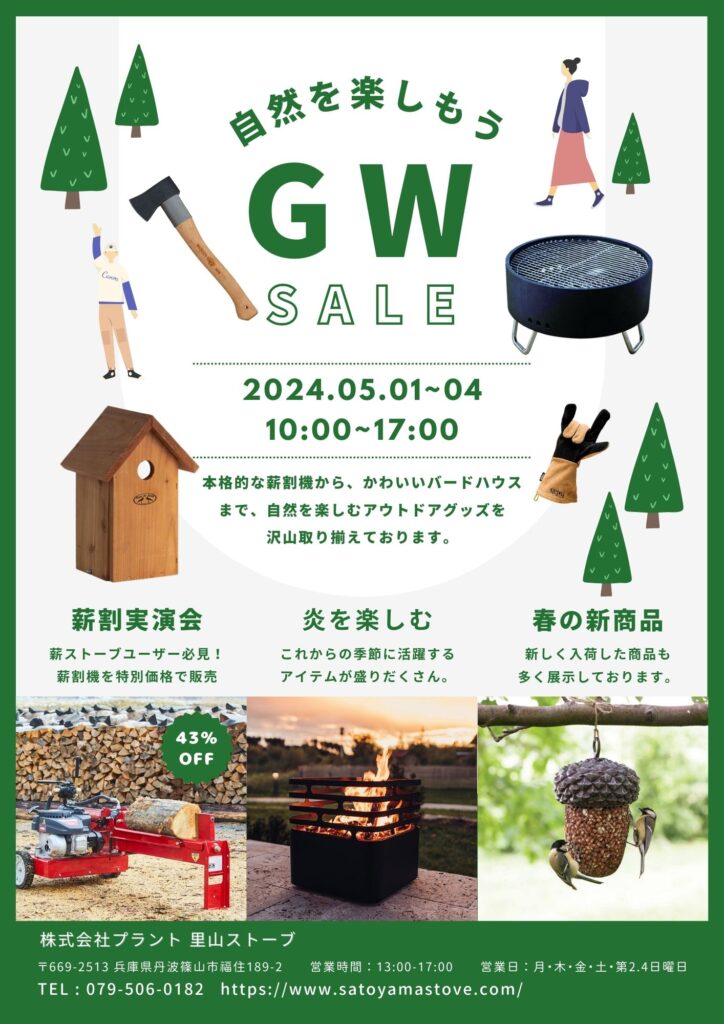 里山ストーブでは、【自然を楽しもう GW SALE 】と銘打って、2024年5月1日(水)〜5月4日(土)の4日間、営業時間を拡大し、皆様のご来店をお待ちいたします。