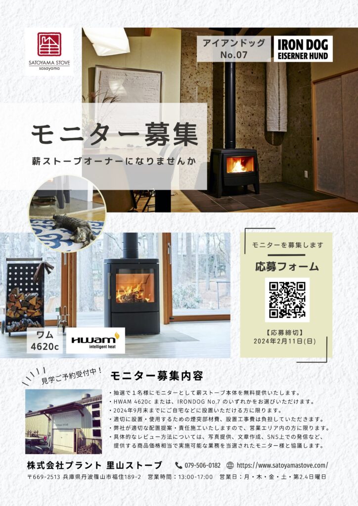 HWAM 4620c または IRONDOG No.7 を実際の暮らしの中で使用し、使用感などをレビューしていただけるモニターを1名募集します。モニターを希望される方は、下記の応募フォームから応募ください。抽選にて1名様に薪ストーブを無料提供し、薪ストーブモニターとなっていただきます。