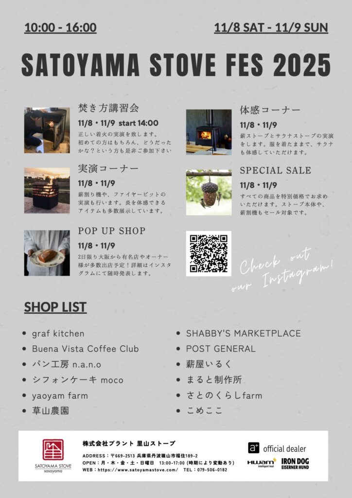 場所:里山ストーブ店舗内および店舗前広場 〒669-2513 兵庫県丹波篠山市福住189-2